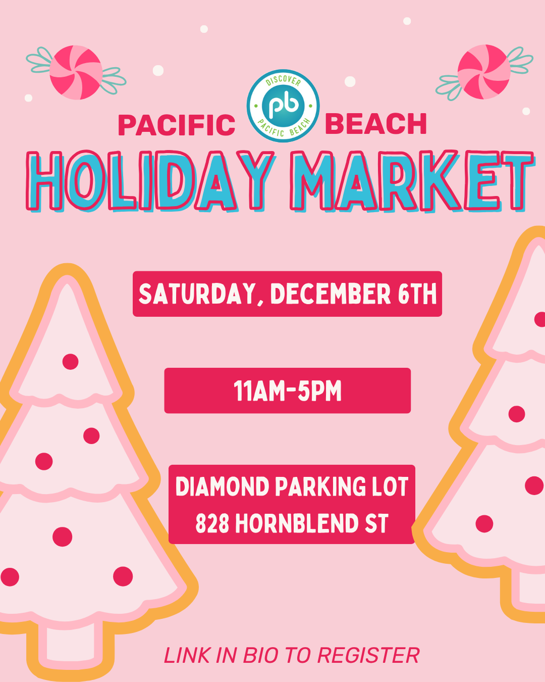 PACIFIC BEACH HOLIDAY MARKET SATURDAY, DECEMBER 6, 2025 11AM TO 5PM FREE TO THE PUBLIC DIAMOND PARKING LOT 828 HORNBLEND ST. This year, Discover Pacific Beach is introducing a brand new activation to our PB Holiday Celebrations! Shop for handmade crafts, unique gifts and delicious treats. You will find us across the street from... Read more »