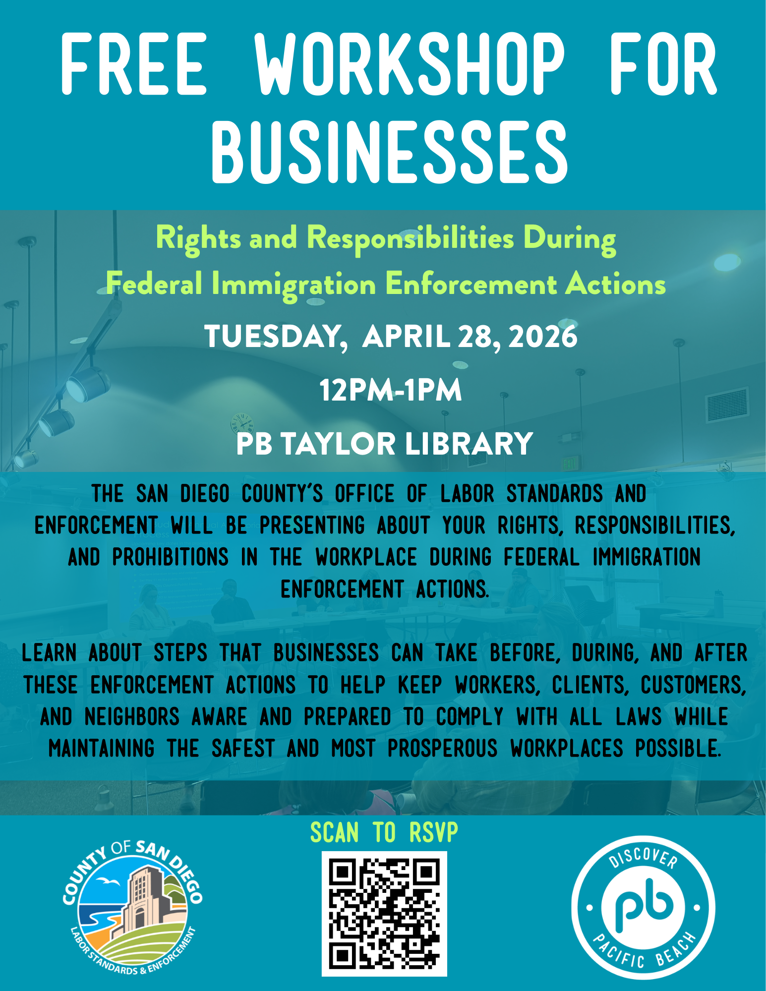 Rights and Responsibilities During Federal Immigration Enforcement Actions TUESDAY, APRIL 28, 2026 12PM-1PM PB TAYLOR LIBRARY 4275 Cass St. San Diego, CA 92109 The San Diego County's Office of Labor Standards & Enforcement will be presenting on your rights, responsibilities and prohibitions in the workplace during federal immigration enforcement actions. Learn about steps that... Read more »